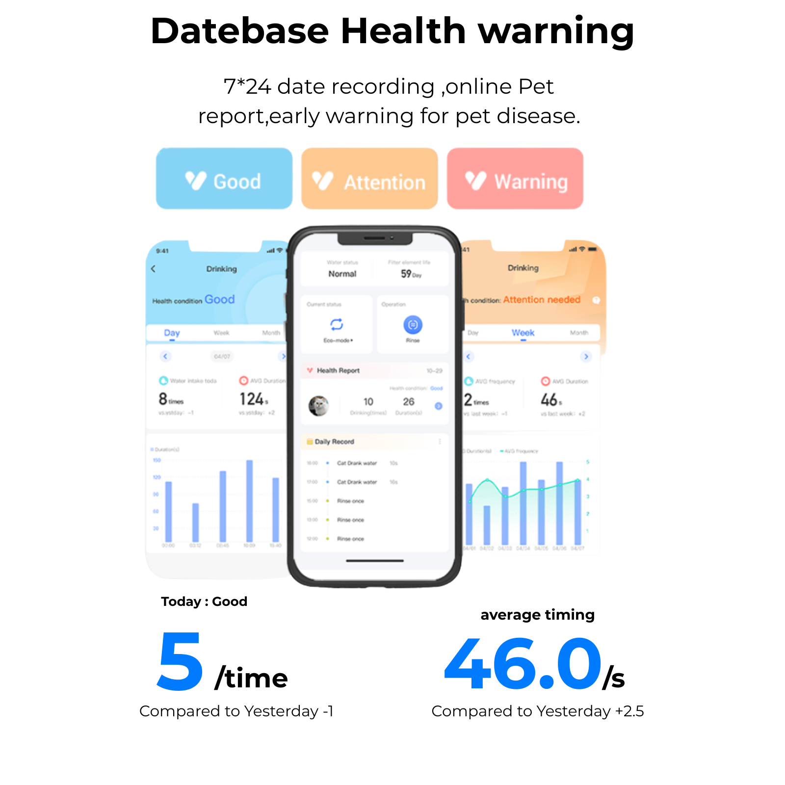 Observes cat's drinking frequency, volume, and duration with CATLINK APP. Reminder of water shortage and filter status.