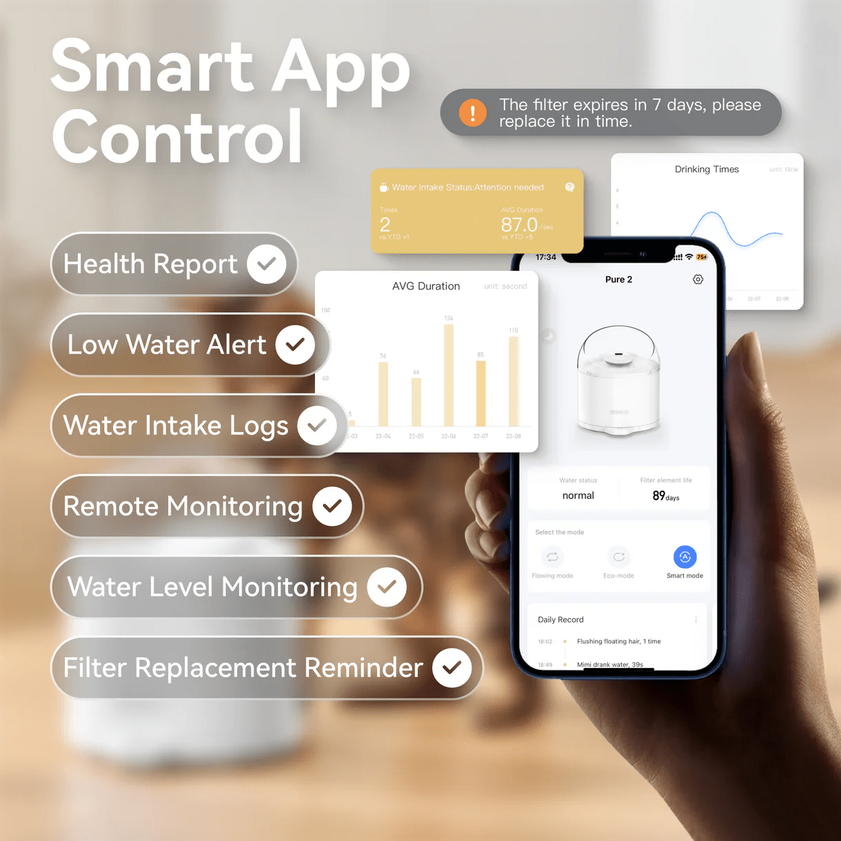 • Lembretes inteligentes: Receba notificações quando for hora de substituir o filtro ou reabastecer a água.