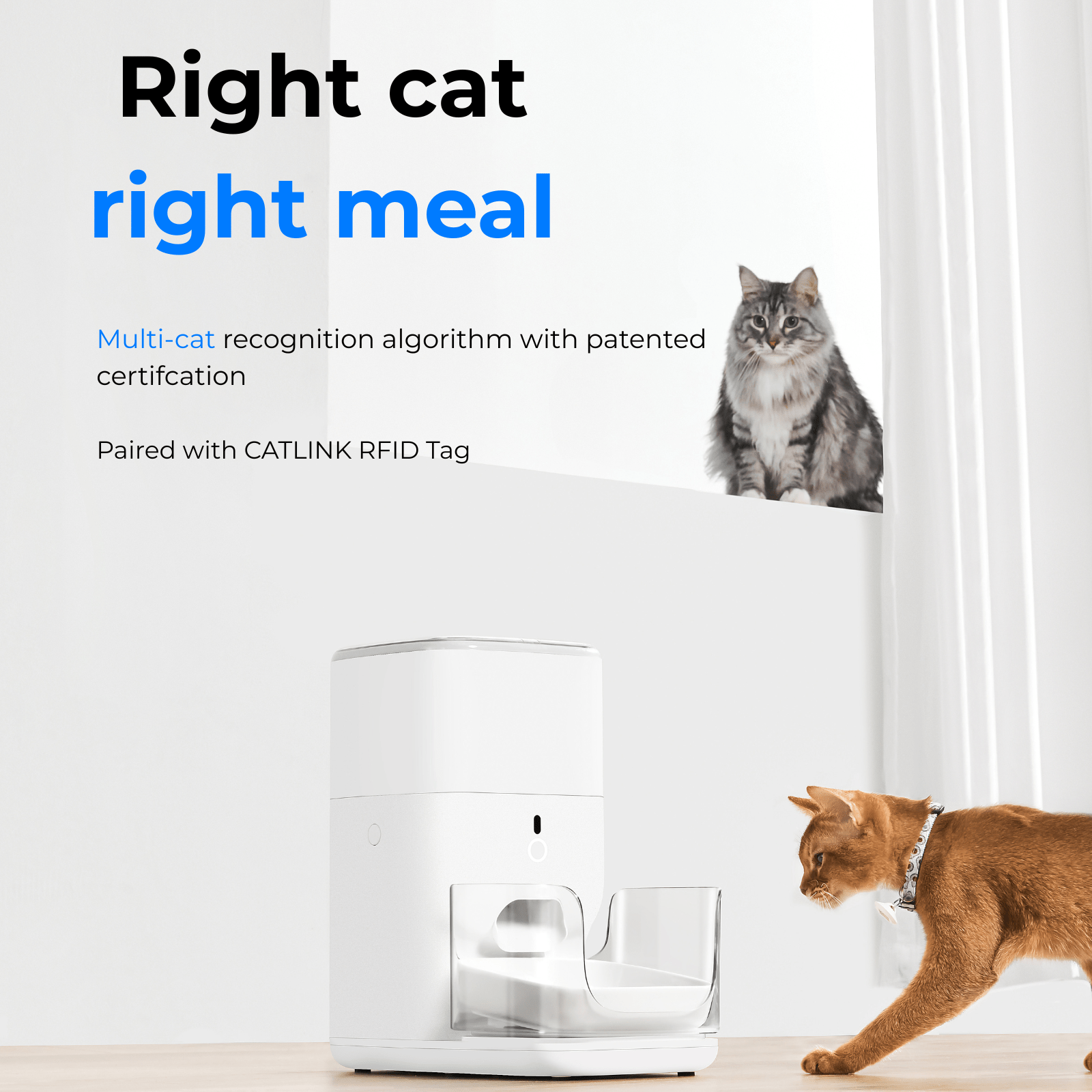 • Monitorizare Inteligentă prin Aplicație și Identificare Multi-Pisici:Urmărește consumul de hrană, setează programe de hrănire și identifică fiecare pisică cu zgărzi CATLINK RFID prin aplicația dedicată.